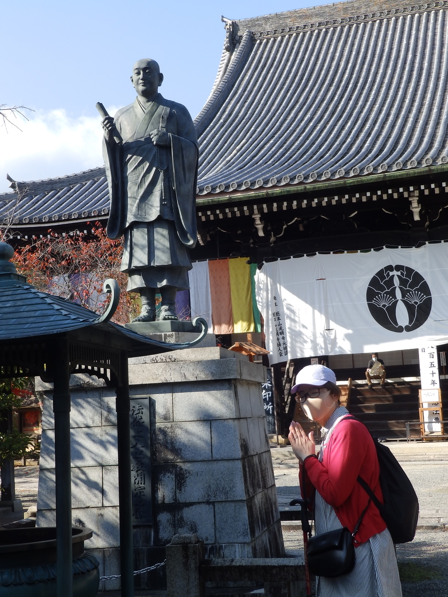 法然上人像 右は勅使門(奥に庭園がありますが無料期間は見学できず)
